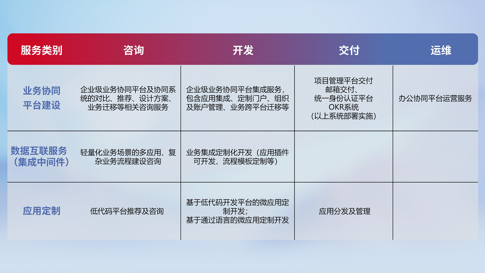 针对钉钉、、企微、、、、IDaas等平台级产品提供产品的规划、、、、方案、、、交付、、、定制化开发等服务,,,,实现如统一协同办公、、、、智能客户服务、、混合会议管理、、、智能数据查询、、、等业务场景,,实现数字化转型。。。。
